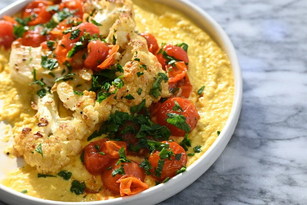 Roasted Cauliflower Steak With Golden Beet Hummus And Burst Cherry Tomatoes